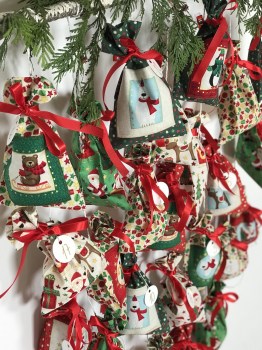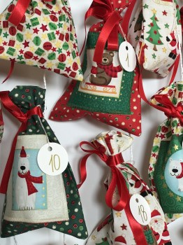 12 pytlíčků je ušito s obrázkovými aplikacemi (sněhuláci, sobík, Santa, méďa, lední méďa, tučňák) na podkladě zelené nebo červené látky s puntíčky a nebo barevné látky s dárečky/hvězdičkami/baňkami